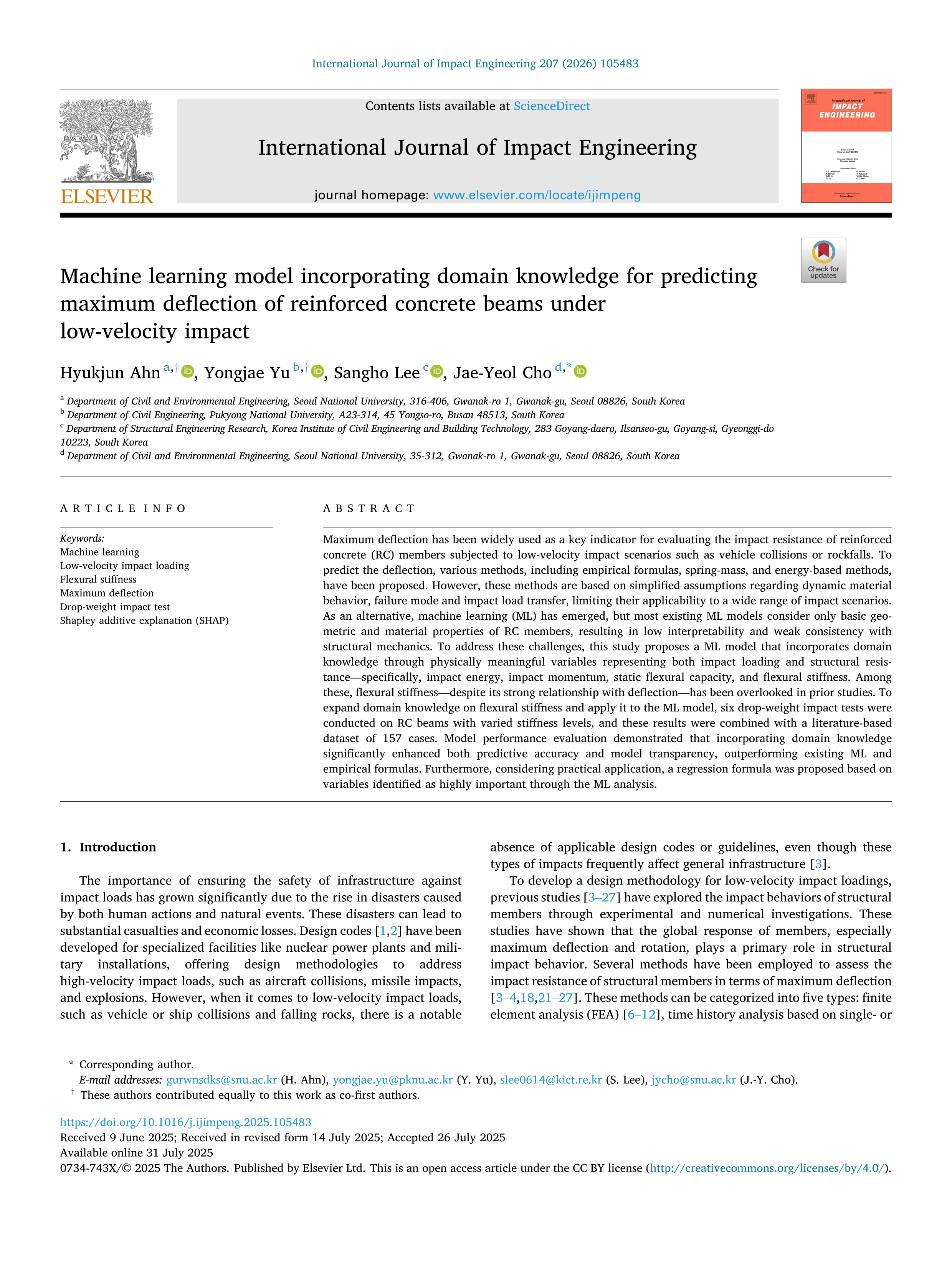 2026.01. International Journal of Impact Engineering 논문 게재 유용재 교수 외 3인의 "Machine Learning Model Incorporating Domain Knowledge for Predicting Maximum Deflection of Reinforced Concrete Beams under Low-Velocity Impact"가 충격 분야 Q1 저널인 International Journal of Impact Engineering에 게재되었습니다.